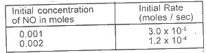 The data in the table above shows the rate of reaction of nitrogen (ll) oxide with chlorine at 25oC It can be concluded that doubling the initial concentration of NO increase the rate of reaction by a factor of