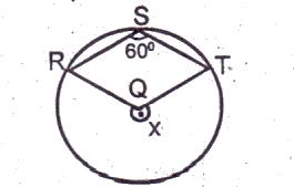 Given the quadrilateral RSTO inscribed in the circle with O as centre. Find the size angle x and given RST = 60o