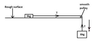 In the figure above, the coefficient of static friction is 0.5. If the tension in the string is T, the acceleration of the system in motion is